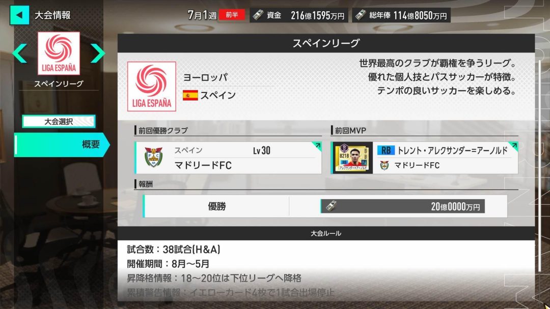 世界各国のクラブを監督として率いることが可能な『サカつく2026』。前回の連載第5回ではドイツリーグに挑戦した(記事リンク)。改めて結果を記載するとリーグ優勝はできたものの、ヨーロッパチャンピオンシップでは優勝することができなかった。ヨーロッパ王者がかかった試合では選手のポリシー合わせやフォーメーションコンボの活用によって、私は監督としてできることを増やしていたが最良の結果が得られず、スランプに陥っていたといえるだろう。そこで、第6回ではドイツリーグよりさらにレベルの高いスペインリーグに挑戦する。「銀河系」とも呼ばれるマドリードFCの監督に就任することで、監督としての私の手腕を磨いていきたい。