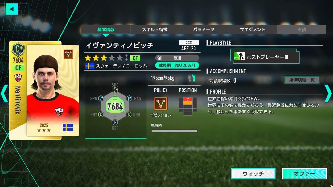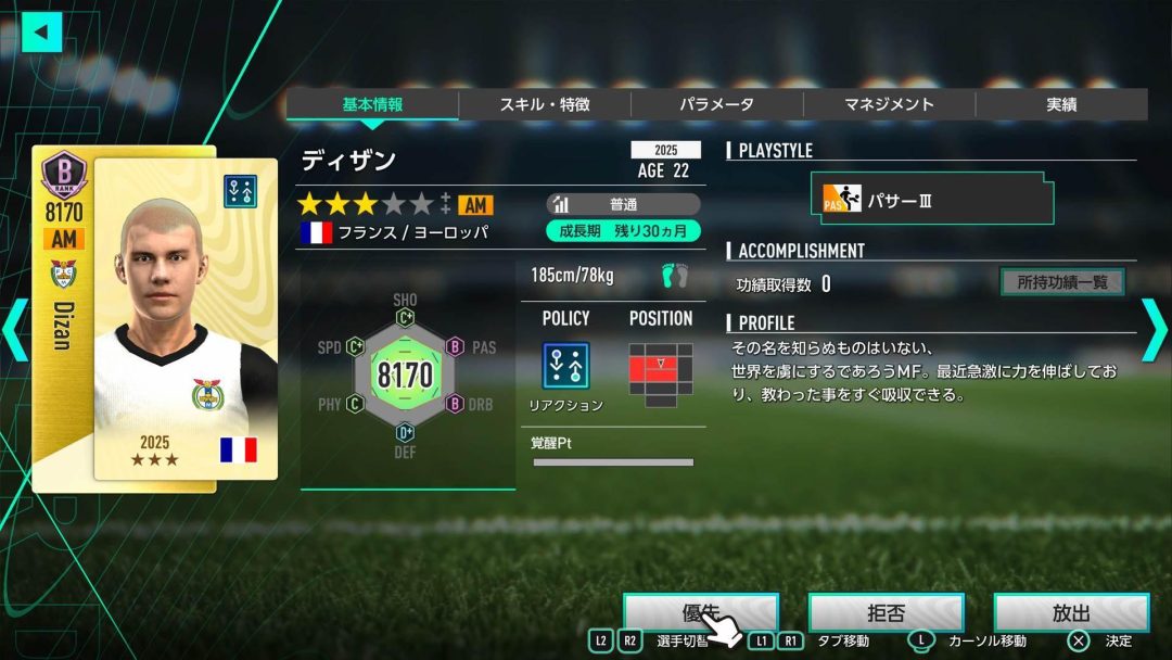 マドリードFCに所属している選手は想像以上に優秀な選手が揃っていた。極めて得点能力に優れたAM(Attacking Midfielder)のジュード・ベリンガムもいれば、LW(Left Wing)で作中最高クラスの突破能力を誇るヴィニシウス・ジュニオールも所属している。ただし、私がとくに興味を惹かれたのはレジェンド選手をモデルにしたと思われる架空選手だ。AMのディザン、CFのマウール、GKのヤロン、LBのマルメロなどそれぞれ実在の名選手たちを彷彿とさせる。このメンバーたちなら、就任1年目からスペインリーグ優勝を狙えるし、もしかしたらヨーロッパ王者に輝けるかもしれない。ただ私が目指すのは、選手頼みの勝利ではなく監督としての成長だ。ドイツリーグでは果たせなかった課題の克服を胸に、私はマドリードFCに就任することを決めた。