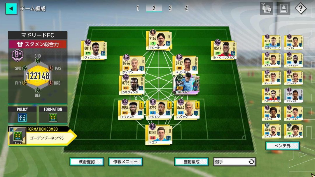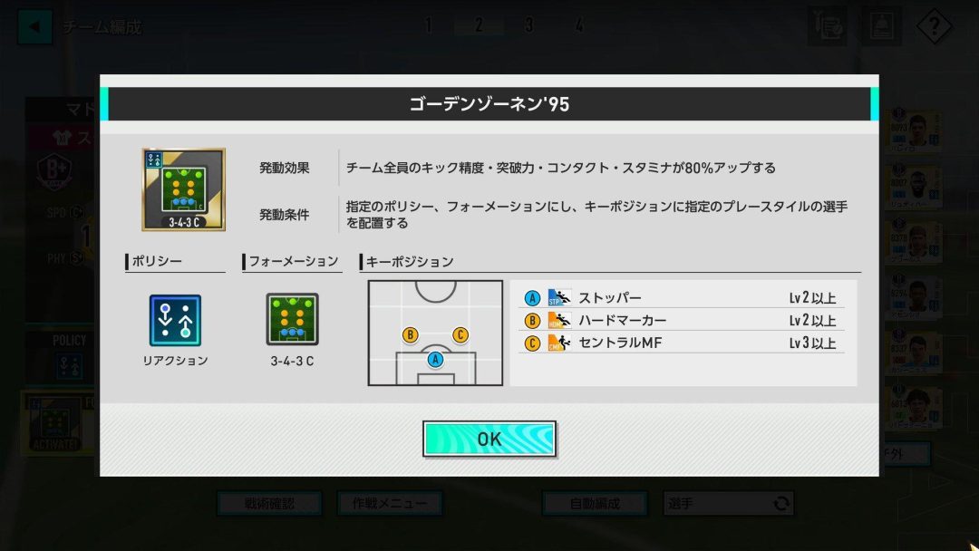 シーズン後半の1月になって、フォーメーションを3-4-3Cへ変更した。初めての金のフォーメーションコンボである「ゴーデンゾーネン’95」を使うためだ。ゴーデンゾーネン’95を発動させることができれば、キック精度、突破力、コンタクト、スタミナのそれぞれが80%もアップするという破格のバフを得られる。それまで使っていたFCハリウッド’01からゴーデンゾーネン’95に変えてスタメン総合力が11万2351から12万1957にアップした。