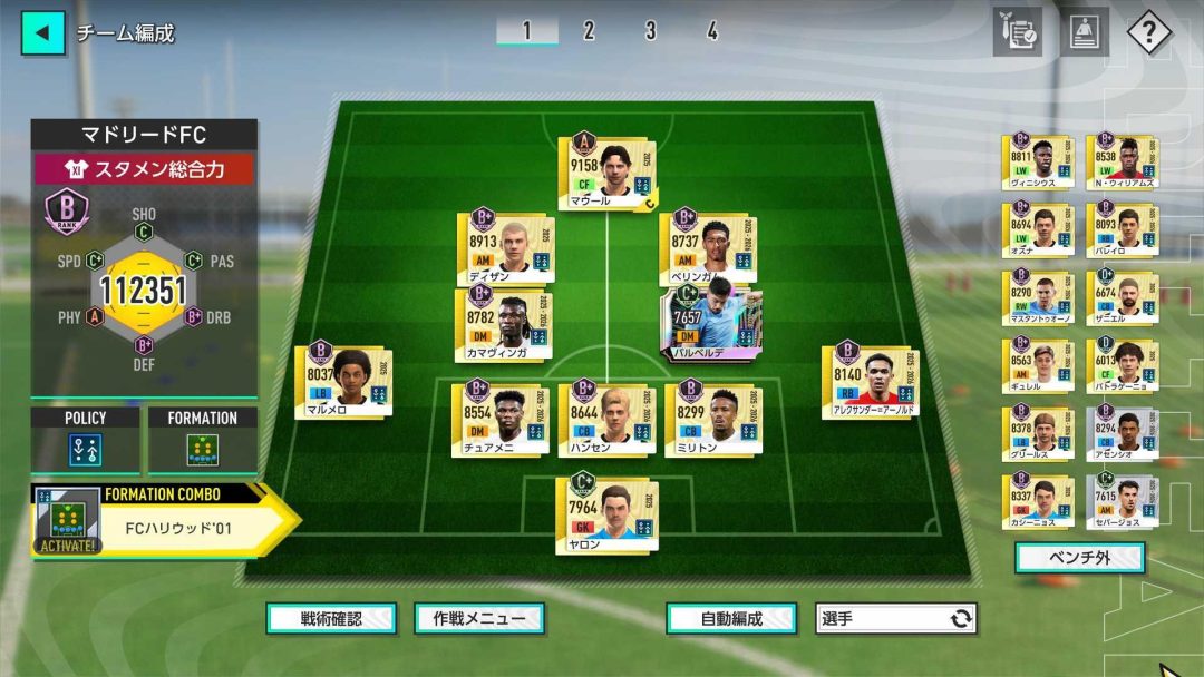 所属選手を見ると、中央からでもサイドからでも攻撃を展開できる分厚い選手層となっている。どのように攻めるかは監督の責任だ。選手やクラブの属性を意味する「ポリシー」は「リアクション」に統一したとしても、中央突破優先かサイド攻撃優先かを決めるのは監督の責務だといえるだろう。それらを決めることによって、自然とフォーメーションと、キーポジションに特定のプレイスタイルを有する選手を配置することでバフが受けられるフォーメーションコンボも決まってくる。