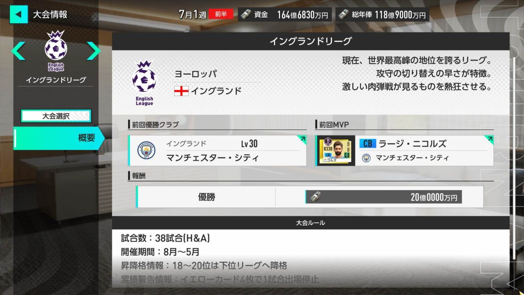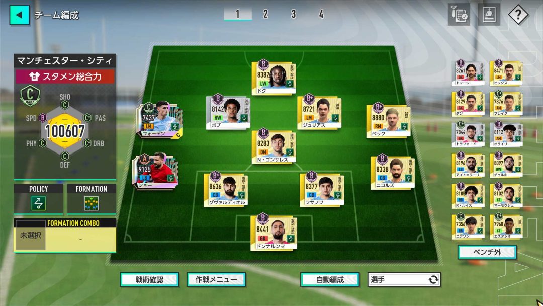 アルビセレステ’01の発動効果はジャンプ、コンタクト、走力、敏捷性が80%も向上するという圧倒的なものだ。フィジカルとスピードが重要視されてきたイングランドのサッカー観に適したもので、この効果によって屈強な相手を上回ることができるかもしれない。フォーメーションコンボを発動する前のスタメン総合力は10万ちょうどといったところだったが、アルビセレステ’01を発動させると一気に11万5000を超えるまで跳ね上がった。ハーランドやフォーデンなどは加入して間もないため、きちんと育成すればスタメン総合力12万も狙えるだろう。各国のリーグで優勝した経験をもつ私は、スタメン総合力が12万を超えれば優勝できるはずだと目論んだ。