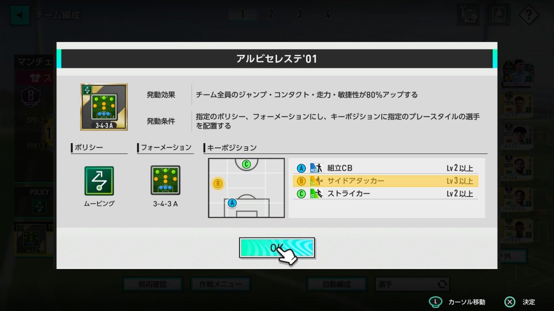 強いクラブを目指すためには、特定の条件を満たして「フォーメーションコンボ」を発動させることが重要となる。フォーメーションコンボは3つのランクが存在し、最上級の「金」のフォーメーションコンボを発動すれば得られるバフはかなりのものだ。そのバフはクラブの強さを示すスタメン総合力にも影響する。ムービングの金のフォーメーションコンボとして、私が注目したのが「アルビセレステ’01」だ。プレイ時点におけるムービングの金のフォーメーションコンボとしては、RMやLMが採用できるのはアルビセレステ’01だけだった。シティに所属しているベックとヒックスをクラブの中心としようと考えた結果、アルビセレステ’01を採用することに自然と決まった形だ。