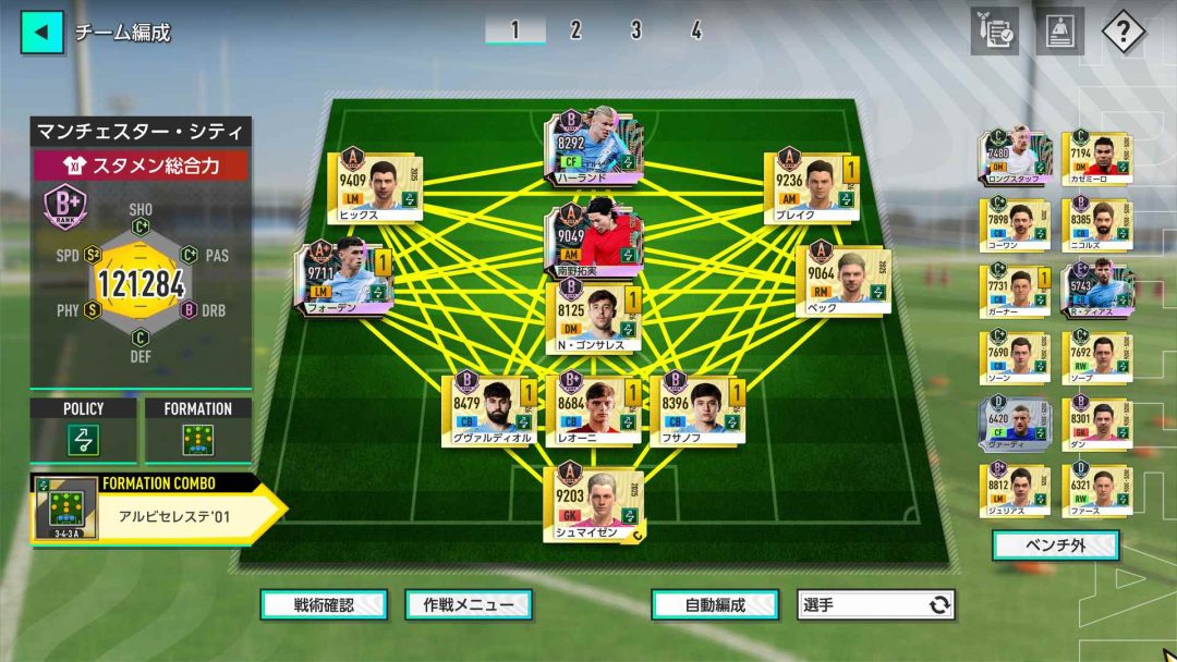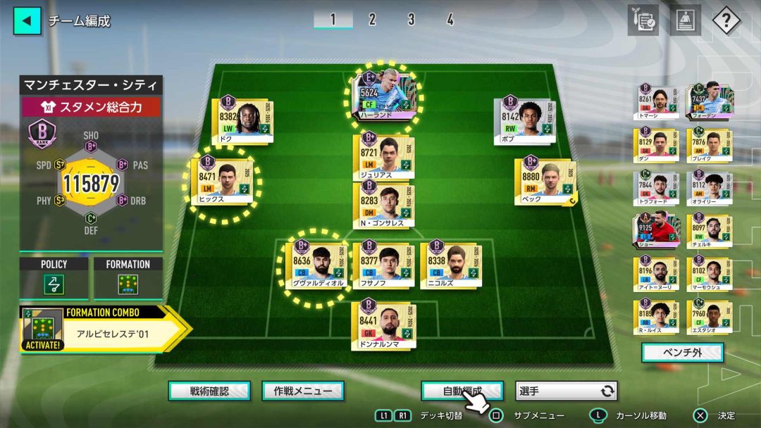 アルビセレステ’01を発動するには、3つのポジションにおいて、特定のプレイスタイルを所持する選手を同時に起用しなければならない。「組立CB II」のプレイスタイルを有するヨシュコ・グバルディオルと「サイドアタッカー III」のプレイスタイルを有するヒックスは所属していたものの、「ストライカー II以上」の選手はいなかった。どうしてもアルビセレステ’01のフォーメーションコンボを発動したかったため、『サカつく2026』の事前登録キャンペーンの達成報酬として配布されたハーランドをクラブに加入させた。ムービングのポリシーをもつ選手でスタメンを固めたかったので、ガチャで当たった南野拓実やフィル・フォーデンも使って戦っていく。