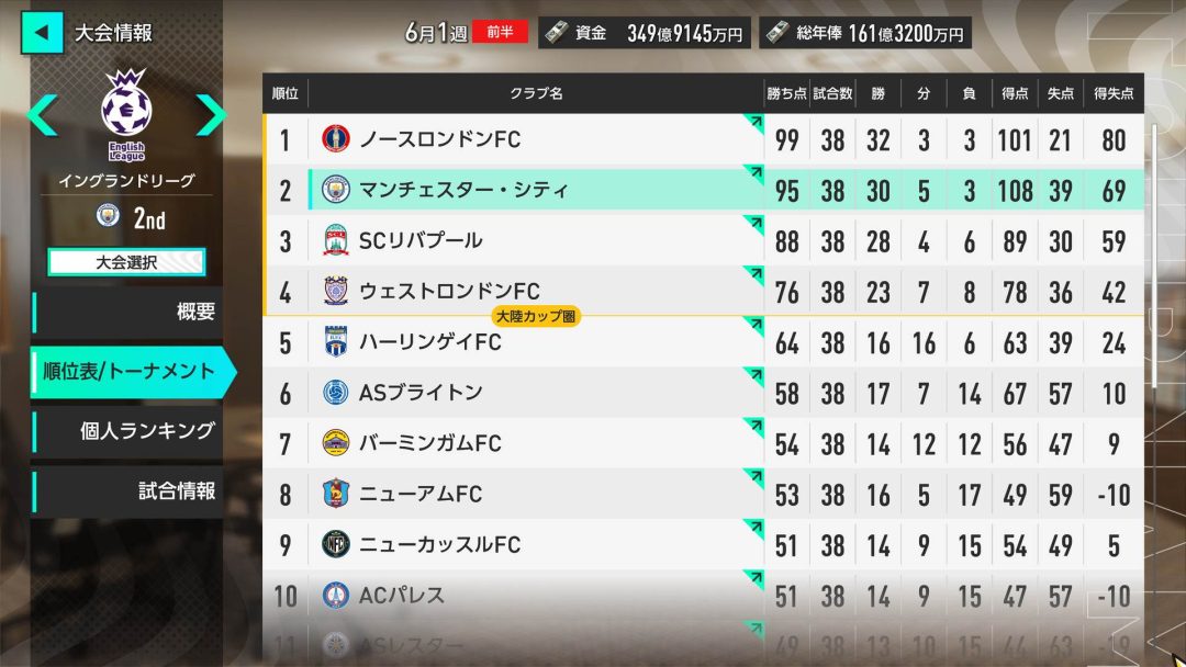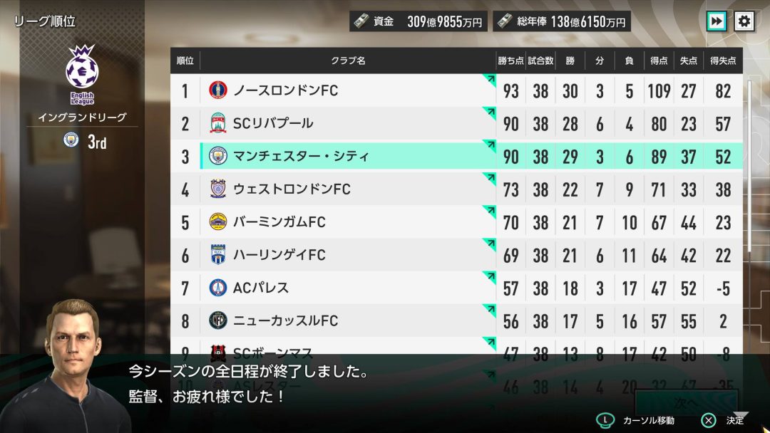 ただベテランを若い選手に入れ替えながら戦っていたため、スタメン総合力は11万7000を超えた程度だった。たとえ思ったほどクラブが成長できていなくても、リーグ戦の38試合で勝ち点90を稼げば優勝してもおかしくはないだろう。しかし、残酷なことに私はシティを就任1年目で優勝させることができなかった。このシーズンにおける優勝クラブは勝ち点93であり、1試合の差で栄冠を逃したのだ。また、勝ち点90で優勝を逃しただけでなく、同じく勝ち点90を記録したクラブに得失点差で劣るリーグ3位の成績となってしまった。