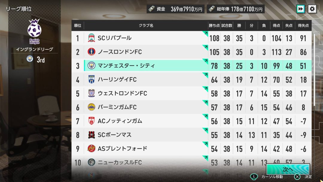 シティが強くなっていくように、イングランドのほかのクラブもまた強くなっていく。それぞれのクラブに所属している選手はベテランになってきて能力が低下するものもいれば、成長期を迎えて著しく能力が向上するものもいる。育成したシティなら勝てるだろうと盲信していた私は、3年目にしてあらためてイングランドのレベルの高さを思い知った。一時は6位まで順位が落ち込み、立て直しても3位に入るのがやっとだった。シティより上の首位と2位のクラブは勝ち点100を超えた。首位のSCリバプールは38試合35勝3分無敗の勝ち点108。あまりに強すぎるというのが正直なところで、無敗ということからわかるようにシティは直接対決でもSCリバプールに勝てなかった。