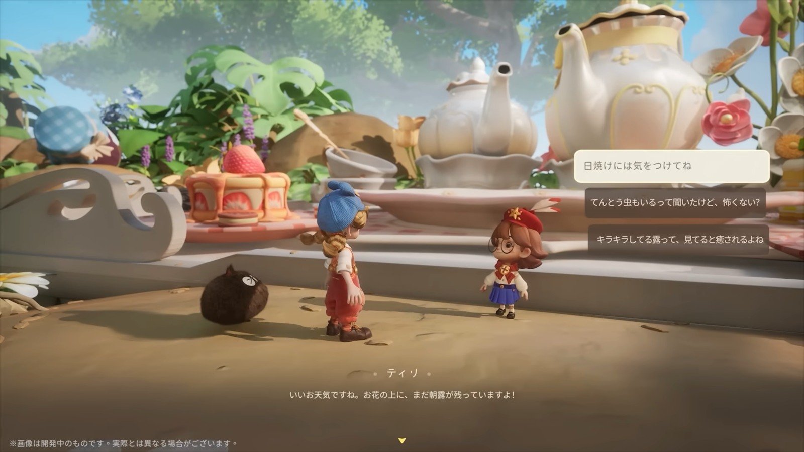 そんな他愛もない会話を交わしていると、不思議と心が軽くなっていく。特に印象的だったのは、プレイヤーよりも小さなリリがこちらを見上げる視線だ。ぬいぐるみのような体に、大きな瞳でこちらをまっすぐ見つめる仕草。その一瞬に庇護欲が刺激されると同時に、自分もこの世界では童心に帰って、純粋なままでいていいのだ、と肯定されたような気分になり、図らずも泣きそうになってしまった。