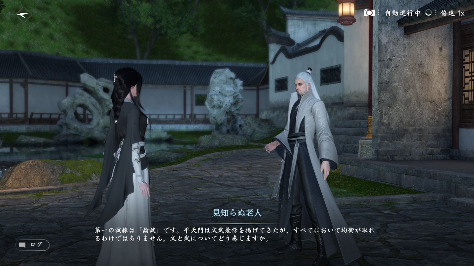 武術の門派の試験ということで、できるだけ戦わずに過ごしてきた筆者はいよいよ戦闘になるのではないかと内心少し怖気づいていた。しかしそれでも腹を括って本山に行ってみることに。マップの表示をたどって程なく到着し、試験官を担当してくれる人に対面する。試験官の話だと、平天門は文武の両立と心の清らかさを重視しており、入門試験は知識テストと生け花でおこなうという。