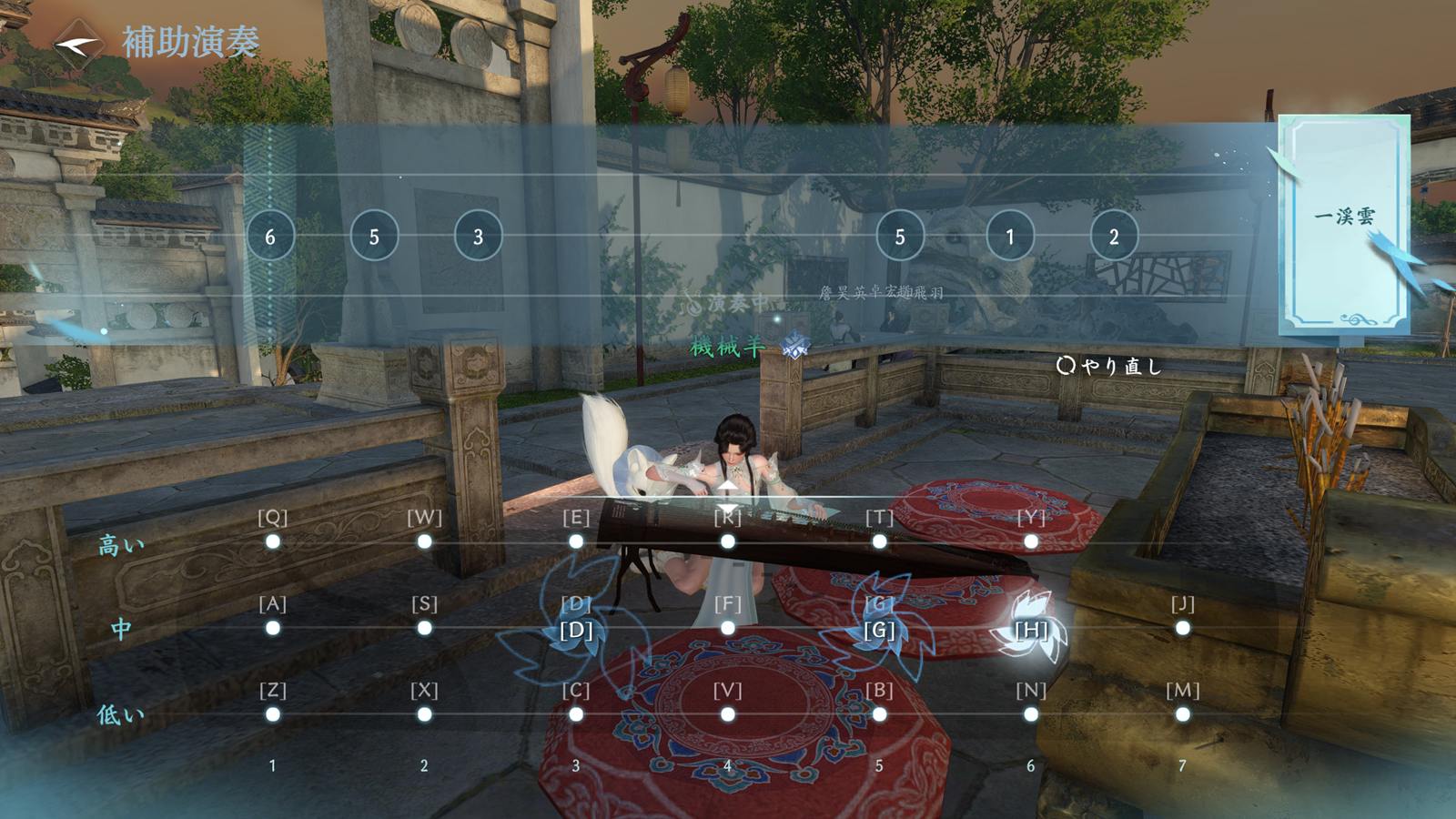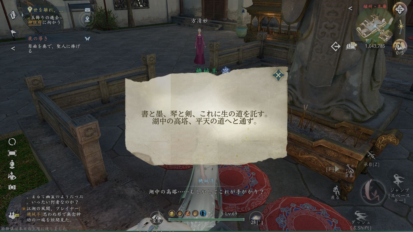 平天門について興味が湧いてきたところだが、この人物は修業が忙しいそうで、すぐに立ち去ろうとする。しかし別れ際に「平天門についてもっと知りたければ、孔子像の下の座布団を調べてみて」と教えてくれた。そういえば、磁州には大きな孔子堂がある。さっそく向かって座布団の下を調べると楽譜が隠されており、「聖人に音を捧げよ」とのメッセージが添えられていた。そして演奏のミニゲームが始まり、実際に曲を弾くことに。演奏システムは以前プレイした“音ゲー”と同様のもの(関連記事)。しかし難易度は抑えめで、難しくはない。クエスト中の必須アクティビティということで控えめな設定になっているのだろう。琴をかき鳴らして、書かれているとおり孔子像に楽曲を捧げてみる。