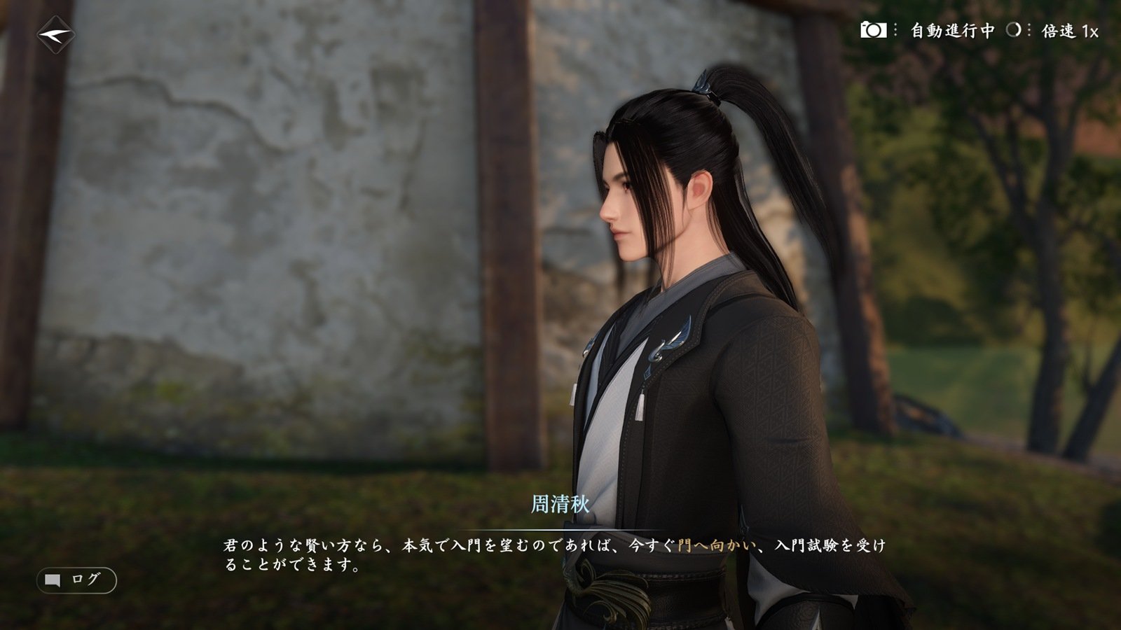 目的地に着くと、塔の下に見慣れないキャラクターが立っている。服装は先ほど会った、ケガをした鹿を連れていた人と同じだ。話しかけてみると、平天門の案内人だという。同輩から「入門希望者を見つけた」と話を聞いたので、ここで待っていたのだとか。どうやら先刻会った人が話を通しておいてくれたようだ。ここまで来れたなら素質があるということで、本山で入門試験を受けさせてくれることになる。