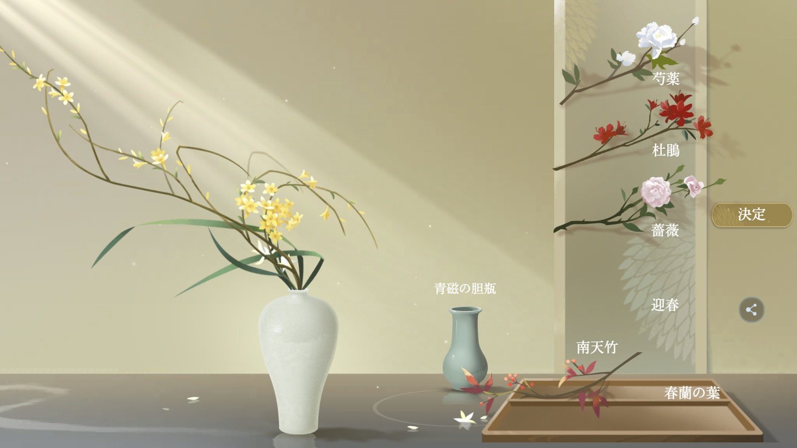 結局すべて勘で答えたが、なんと合格点だと言われてしまった。想定外の事態に戸惑いを覚える。合格ラインが緩めなのか、それともやたら勘が冴えわたっていたのか。事実はわからないまま第二の試験の生け花へ移行する。ここでこれまでやったことがないミニゲームが始まり、実際に花瓶に花を活けることに。チュートリアルによると、メインフラワーとサブフラワーを選び、主役を引き立てるように飾り付けようとの説明だ。