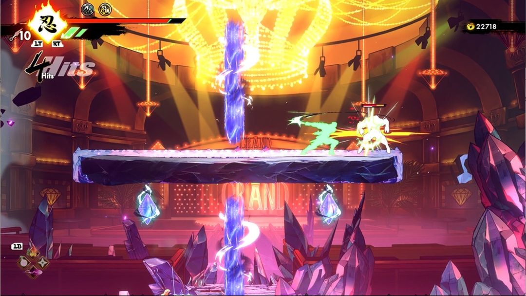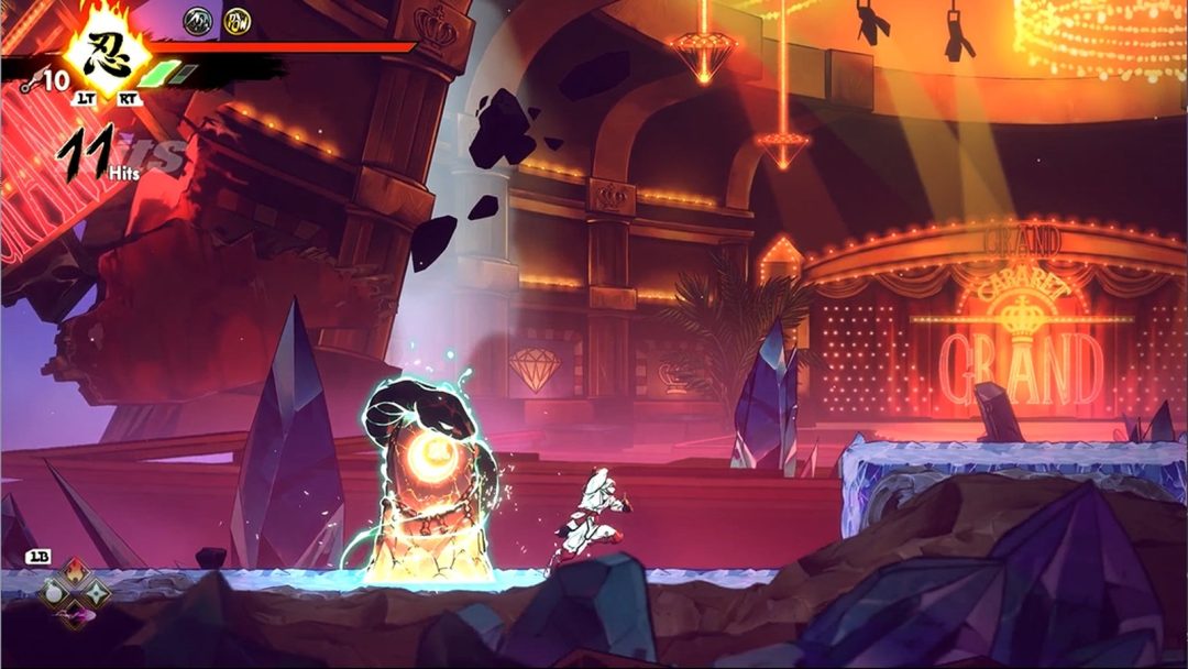 「結晶街道」をクリアすると、今度はボスステージ「狂犬」が解放される。ステージの背景にはネオン看板やビルがずらりと並び、どこか妖しげな雰囲気が漂う。いくつかのエリアを抜けると、背景には突如としてキャバレー「グランド」の看板が姿を現す。そのまま店内の豪華な装飾を背に、強力な敵モンスターたちと戦うことになる。「グランド」の背景は本作のレトロな雰囲気とよく調和しており、アートとしても魅力的だ。自然と気分が高まるなか、ギミックを駆使して敵を蹴散らし、ボスの待つエリアへと向かった。
