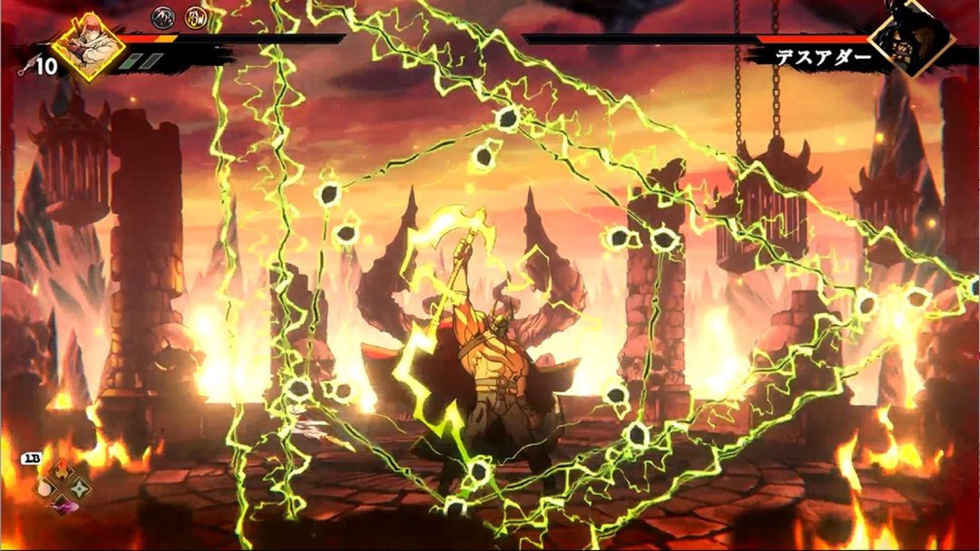 ステージの背景やデスアダーのビジュアルは、『ゴールデンアックス デスアダーの復讐』のボス戦をもとにしたデザインになっている。ムサシの前に立ちはだかるデスアダーは彼が見上げるほど大きく、かなり迫力がある。黄金の斧と竜の盾を携えた姿は威圧感がありつつも、スタイリッシュでかっこよく、本作のグラフィックにも自然に溶け込んでいる。開発を手がけたLizardcubeの表現力の高さがうかがえる仕上がりだ。