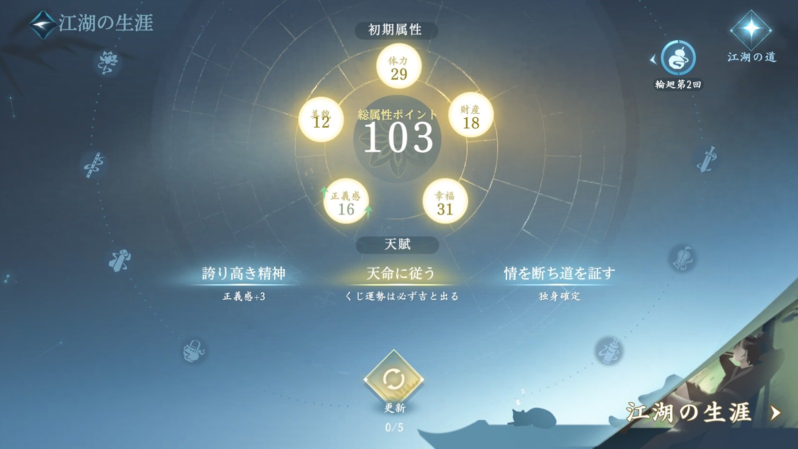 「江湖の生涯」は汴京の街中にいる、とある人に話しかけることで遊ぶことができる。ゲームはまず生まれる前からスタート。初期ステータスがランダムに割り振られるほか、天賦と呼ばれる固有能力が3つ設定される。今回の天賦では正義感とくじ運が上がるかわりに、生涯独身確定になるという。生まれる前からちょっと世知辛い運命を突き付けられてしまっているが、ともかくゲームを始めてみる。