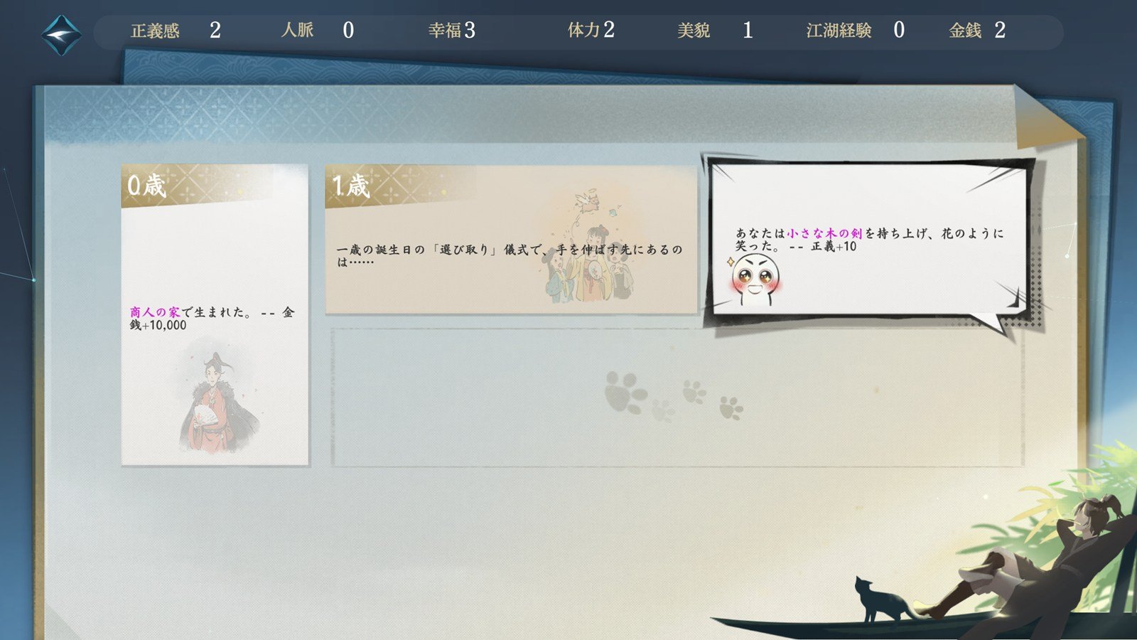 もう一度人生ゲームを始めると、今度は違う天賦や能力値をもったキャラクターが表示された。きっと次は前回とは違う人生を送れるだろう。また今回遊んだ「江湖の生涯」のほかにも、ミニゲームとしては人狼ゲームやボードゲームなどがあり、複数人で遊べるものも用意されているようだ。ソロで先行プレイしている筆者はそちらは未プレイだが、製品版ではいろんなミニゲームをフレンドと遊ぶのも楽しそうである。