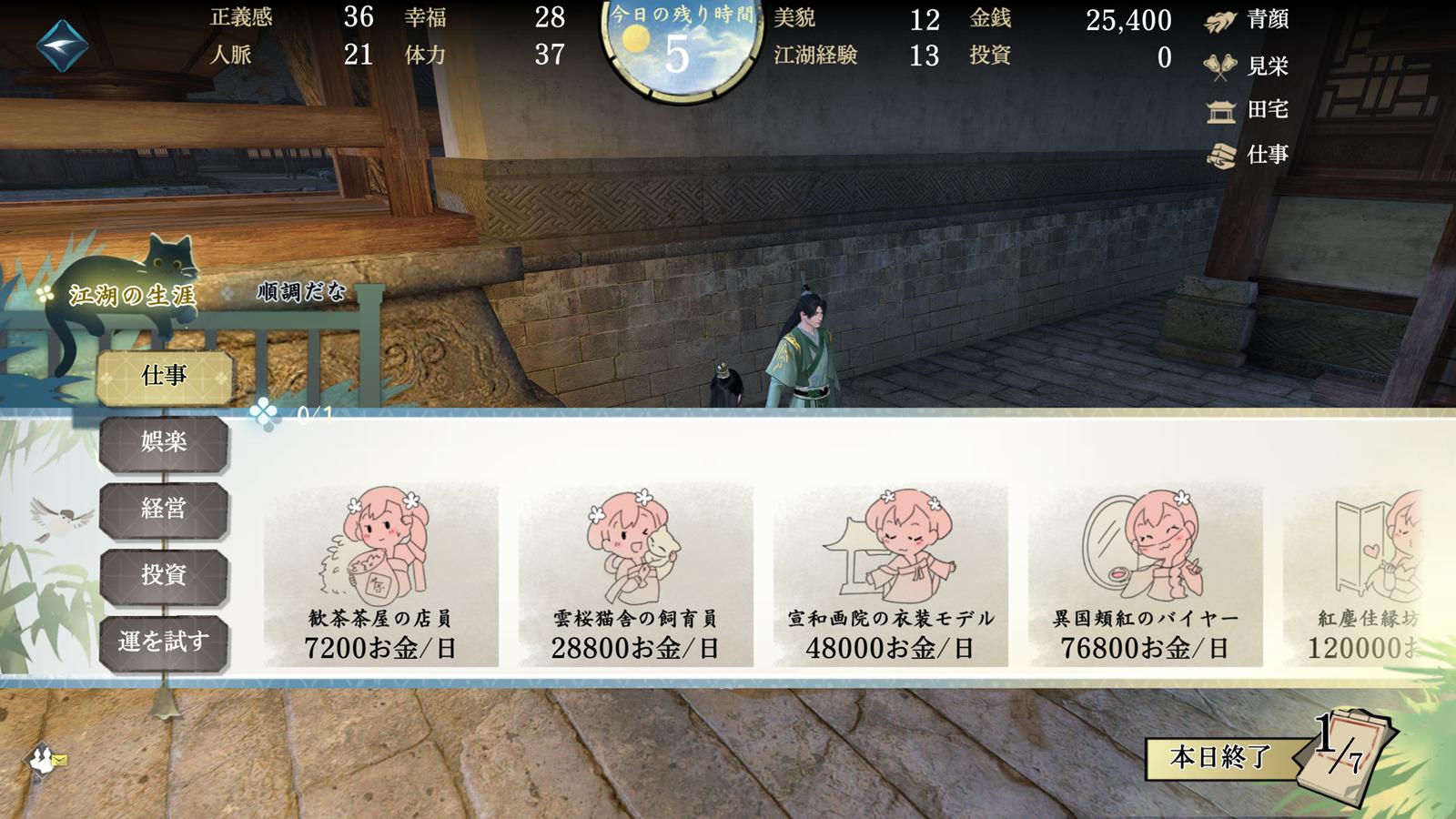 人生を楽しむにも先立つものが必要だ。とりあえず仕事を探すと、茶屋の店員や化粧品のバイヤーなど、いろいろな職業が表示された。賃金はかなりの格差があり、一番安いものと高いものでは二桁の違いがある。高給が欲しい筆者は、一番給料のよい結婚斡旋所の仲人に応募してみる。しかし「人脈が足りない」と表示され、就職に失敗。なるほど、仕事には特定の能力が求められるのだ。仲人には並外れた人脈が必要ということなのだろう。