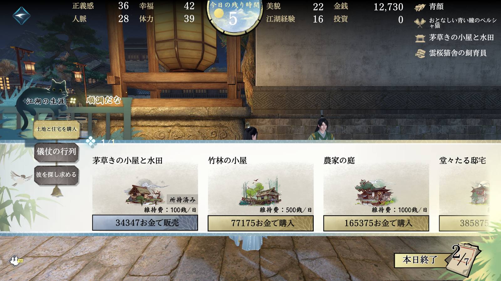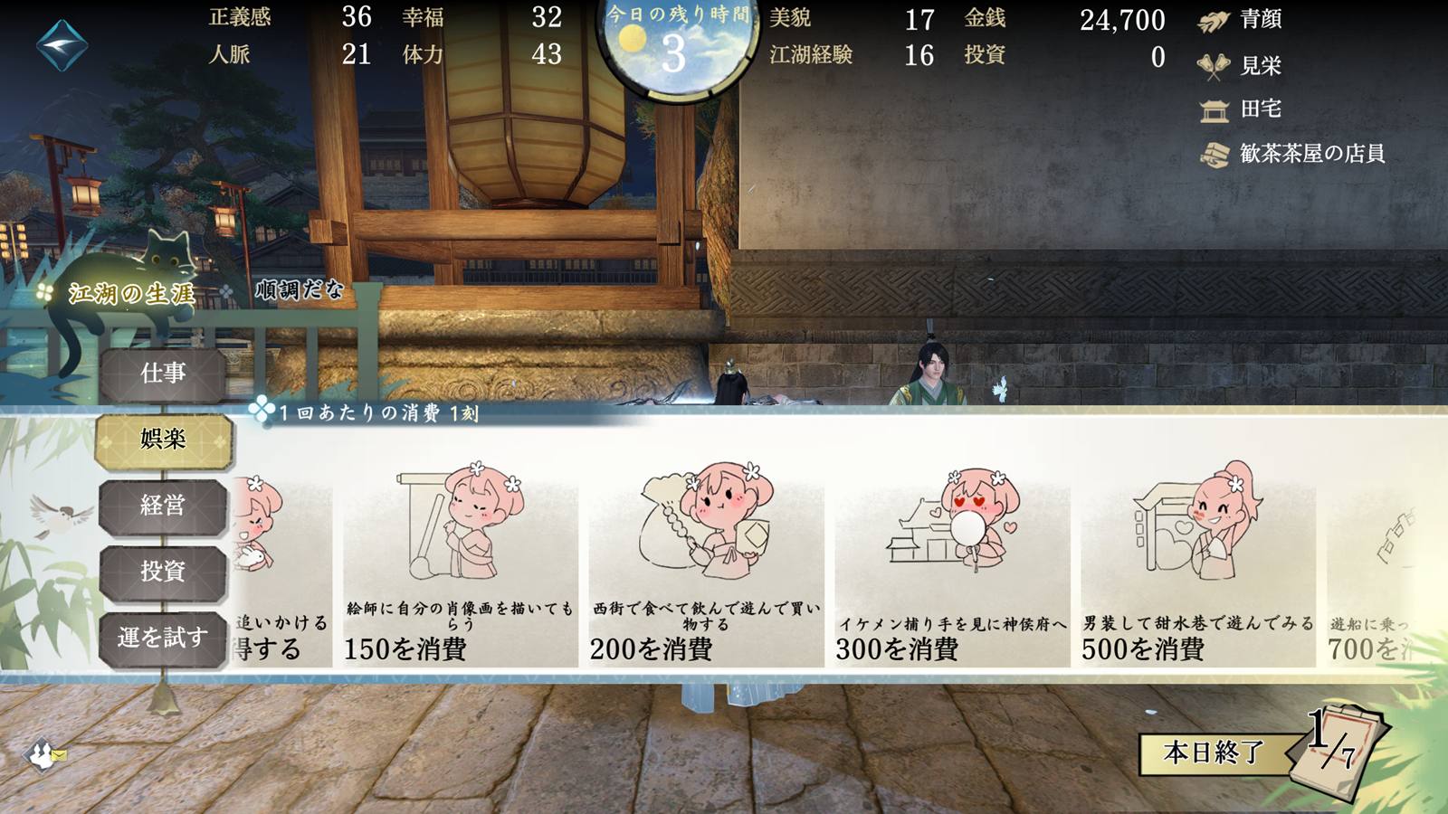 すると選択肢が表示され、集客としてサクラを雇って行列を作るか、お茶のおまけにお菓子を付けるか、と経営の選択肢が表示される。このキャラクターは天賦として正義感が強かったはずなので、サクラを雇うのは性格に合っていない気がする。真っ当な手段としてお菓子を付けてみることに。しかしお菓子が甘すぎて不評ということになり、客が減ってしまった。なかなか上手くいかないものである。