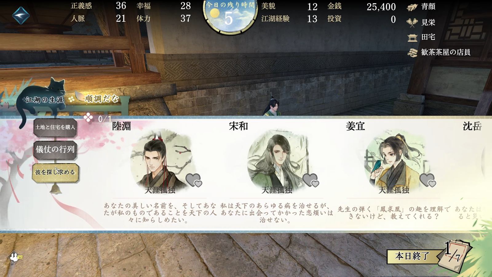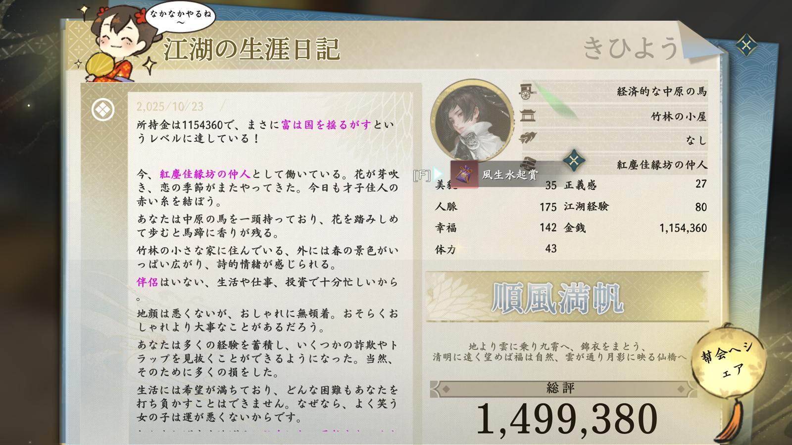 そんなミニゲーム的なコンテンツのなかに「江湖の生涯」というものがある。これはいわゆる人生ゲームのような内容だ。毎日のコマンドを選びながら、お金を貯めたり恋人を作ったりして、ハッピーな人生を送ることを目指す。ミニゲームと呼ぶにはなかなか力が入っているので、本稿でご紹介しよう。