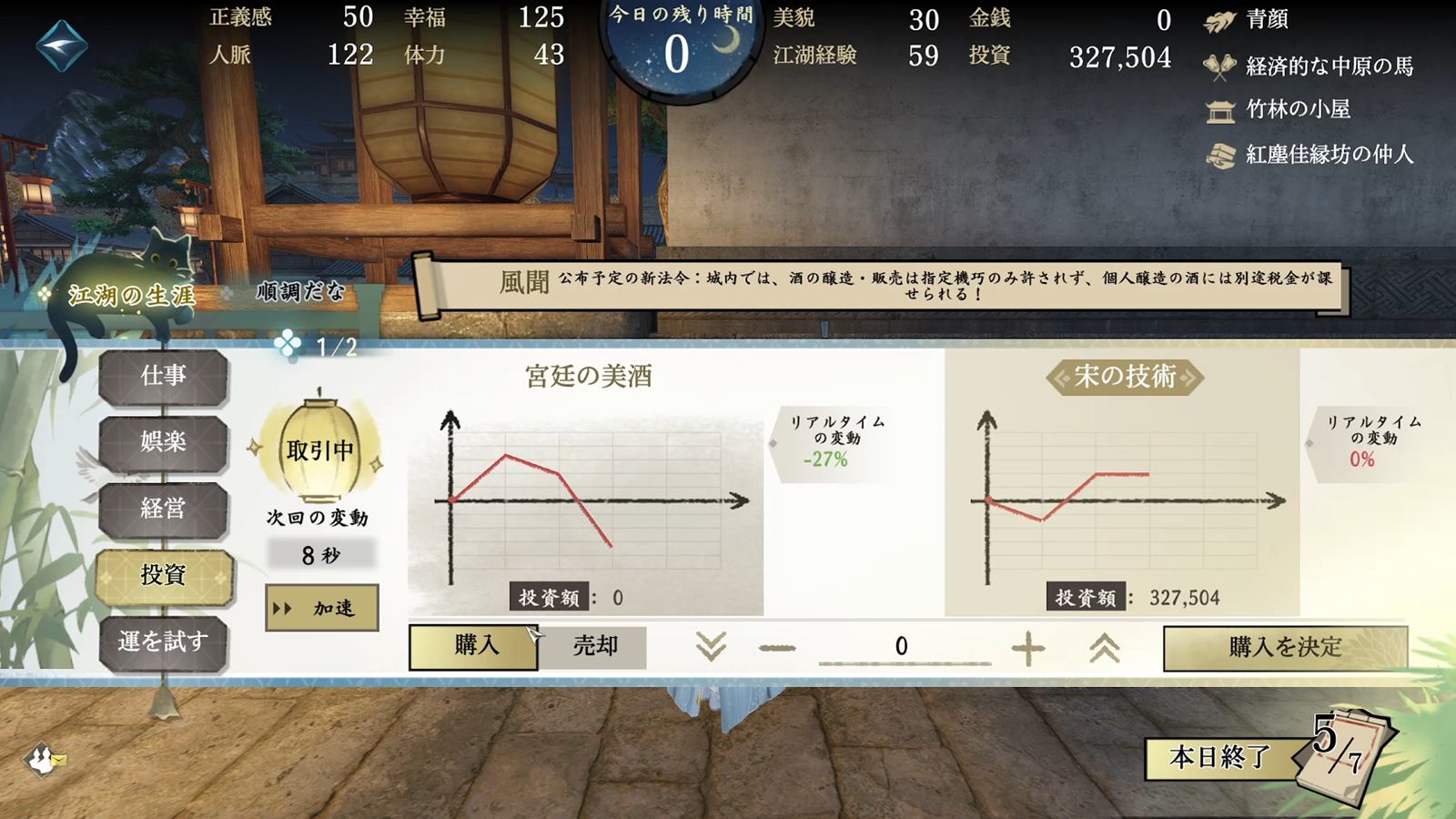 さっそく宮廷の美酒という分野に投資してみると、順調に値が上がっていく。20%ほど上がったところで売って利益を確定させようと思ったが、売却する操作が一瞬わからず、数秒もたついてしまう。そうこうしているうちにリアルタイムのチャートは暴落し、買ったときの値段より低い値段で売ることになってしまった。とんだ損失だ。