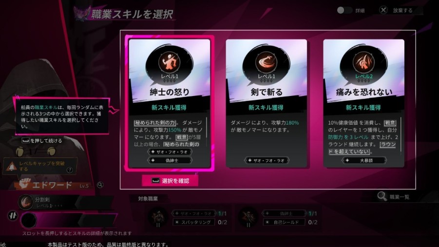 主人公を含めたパーティーメンバーは、冒険を通じて成長していく。なかでもキャラクターのレベルをそれぞれ5と10に到達させることで可能となる転職は、使えるスキルやステータスに影響を及ぼす重要な要素だ。ランダムに提示される3択のなかからスキルと職業を選択する形式であり、パーティー内での相性や倒したいボスに応じたスタイルに臨機応変に変えていくことが肝要となる。また、各キャラクターやスキルは組み合わせによって相乗効果を発動させることもあるため、選択の幅は無限大だ。