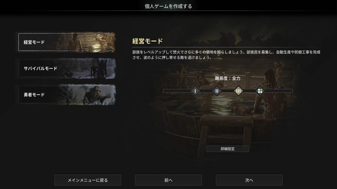 上記ふたつのモードはいずれもとにかく「やれることが多い」。つまり、時間が溶け放題である。だが、逆にそうした経営/クラフト要素をなるべく排したいならば「勇者」モードが最適だ。このモードでは部族の人口を増やす必要はなく、ただひたすら戦うことで強くなることができる。本作をアクションアドベンチャーのように楽しみたいなら、このモードで始めることをお勧めする。3種類のゲームモードにはそれぞれ数段階の難易度設定が用意されているほか、これらとは別に詳細なゲーム設定を調節することも可能なので、自分好みの設定を探してみるのも良いだろう。