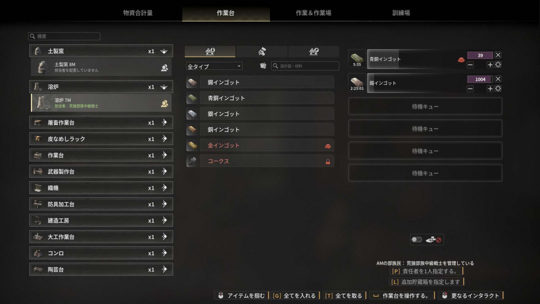 1.0正式版では、蛮人に仕事を割り当てるシステムにも改善が入っている。これまでは蛮人ひとりひとりに作業内容を登録するか、作業台に対して蛮人をアサインして仕事を割り振る必要があった。1.0正式版ではこれらの操作を「総合部族管理」メニューで一括管理することができるようになっている。「総合部族管理」メニューでは、拠点内にある作業台に遠隔でアイテムの作成キューを入れたり、担当者を配置したりできるほか、部族が保有する資源の数も一覧で確認することができる。この機能のおかげで部族運営が格段に楽になった印象だ。
