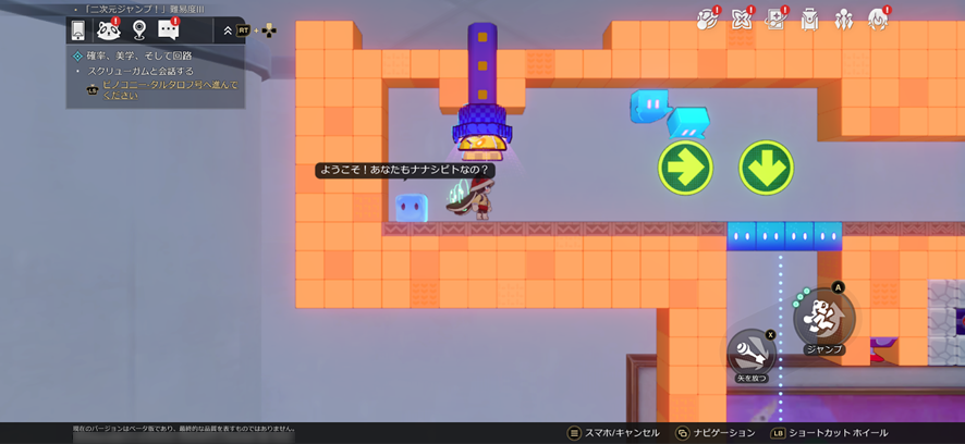 ミニゲームの名前は「二次元ジャンプ!」。その名の通り、2D(二次元)の横スクロールアクションゲームで、「開拓の妖精」という小人のようなキャラになり、3段ジャンプと弓矢を駆使してステージをクリアしていくというもの。