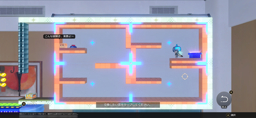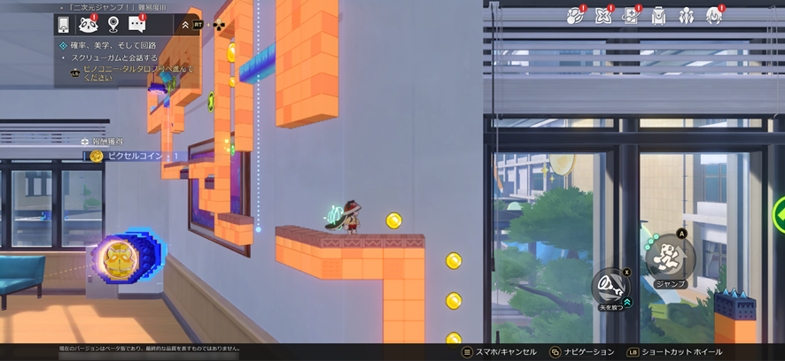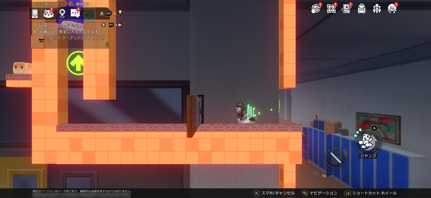 「2D横スクロールアクション」というジャンルだけで言えば古典的だが、シチュエーションがあまりにも新しい。現実とゲームの共存がテーマだと思われる二相楽園ならではの、すばらしい演出だ。