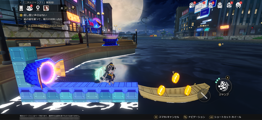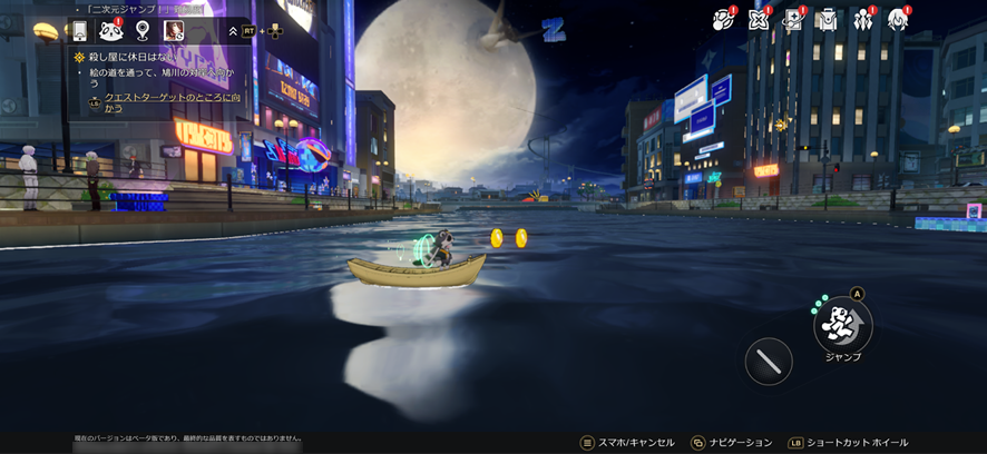 大都会に流れる川を風情ある小舟でGO! それはもう二次元ジャンプと言うよりシンプルな川渡りでは?
