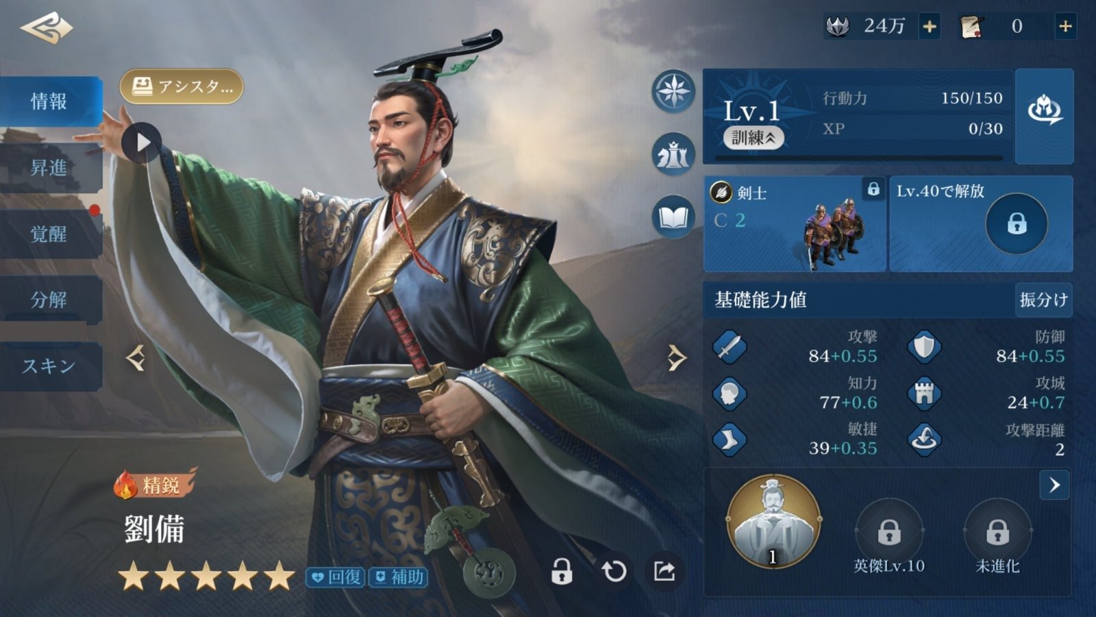 専用の称号を解放すればさらに通常攻撃距離+1の効果も付与できるので、組み合わせ次第では速攻型の編成も考えられる。また、バフ効果を複数付与されると強化される関羽との相性はすこぶる良いだろう。そのまま曹操とも組み合わせ、運命「三国乱世」の発動を狙うのもいい。安定した回復・支援が魅力の英傑だ。