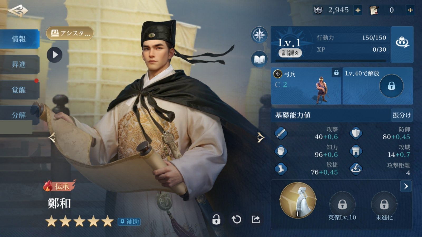 三宝太監(進化後):固有スキルの回復効果は知力と防御の内、高い方に基づく。また固有スキルの発動率が5%増加する。