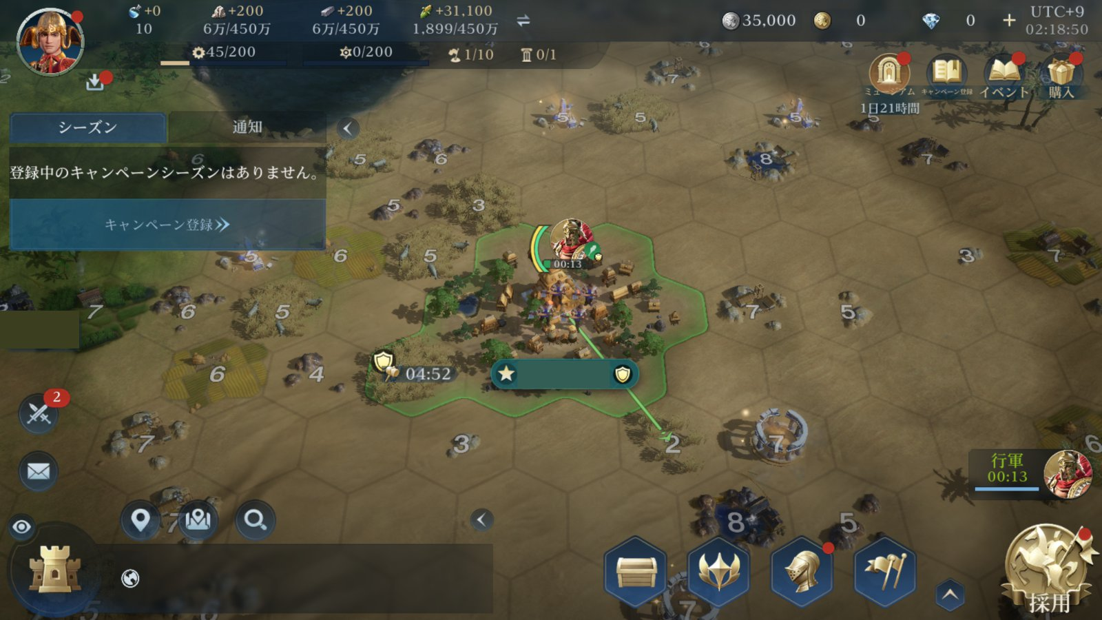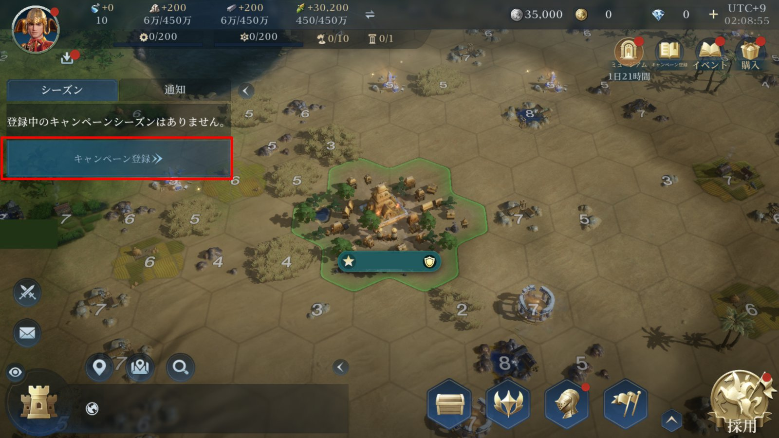 これまでのシーズンが終了し、グランドロビーに入ると、画面左側の「キャンペーン登録」というボタンからキャンペーンを選択する画面に移行できる。