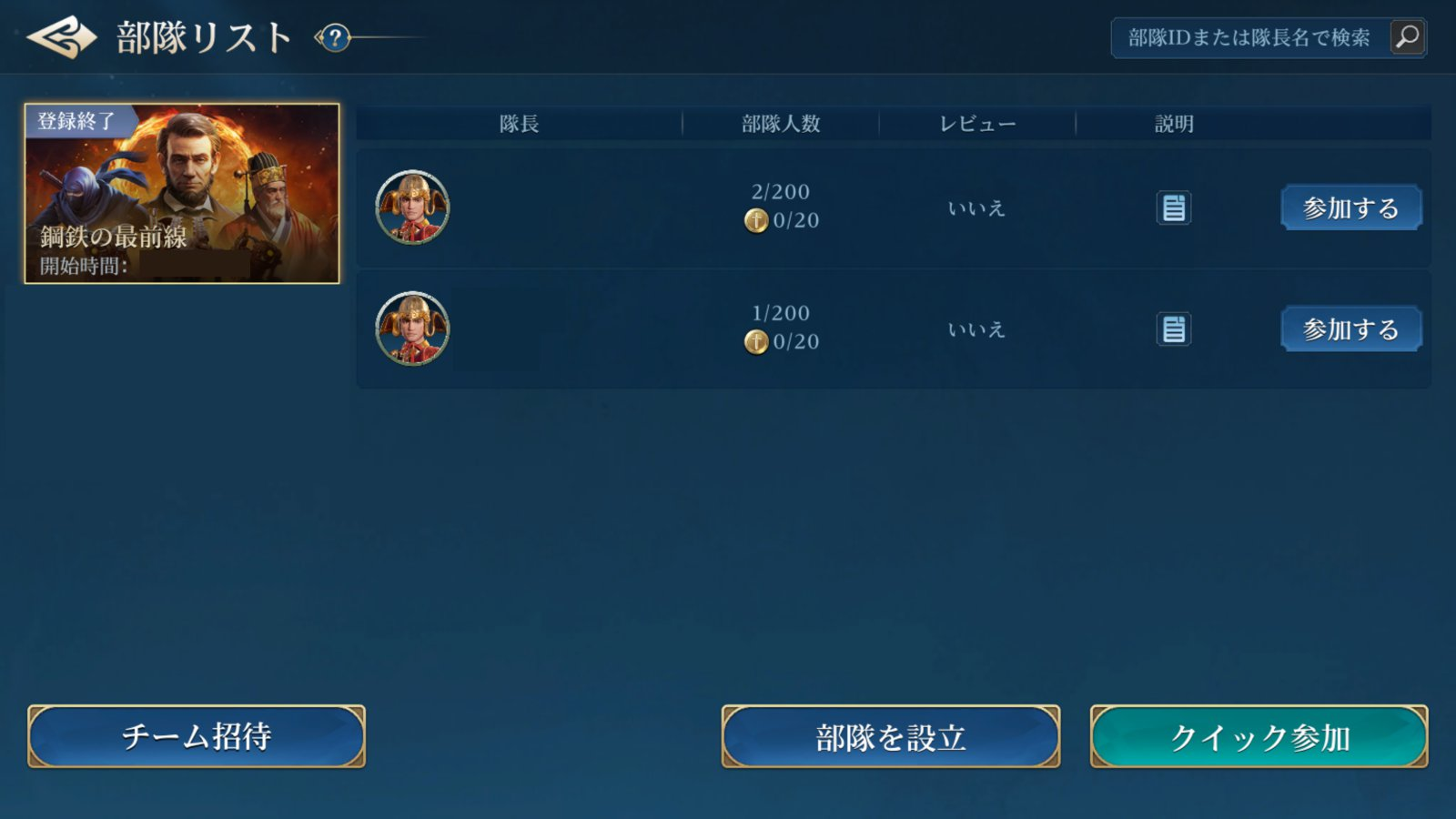 部隊に参加する場合、グランドロビーのキャンペーン選択画面の左側、「部隊リスト」からお好みのものを選ぼう。部隊IDでの検索や、「クイック参加」でランダムな部隊に加入することも可能だ。キャンペーンの登録期間が終了すると部隊の参加や脱退、変更はできなくなるため、選択ミスや登録期限に注意してほしい。