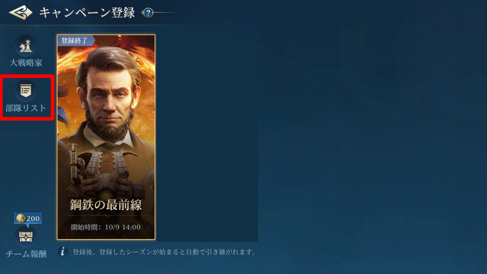 なお、キャンペーンや部隊の登録には期間が決まっており、前シーズンに7日以上ログインしておりキャンペーン登録を行わなかったプレイヤーは、自動的に個人登録でキャンペーンが割り当てられる。そのため新シーズンでどこのキャンペーンにも入れないということにはならないが、遊びたいキャンペーンや一緒に遊びたいプレイヤーなどがいる場合には登録忘れに注意しよう。