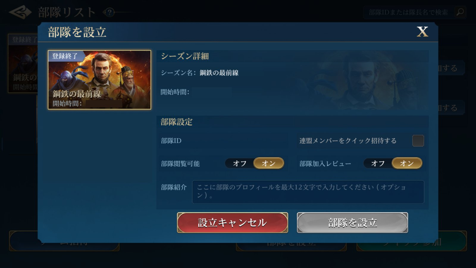 また、部隊リストの「部隊を設立」から部隊を自分で設立することもできる。グランドロビーで結成した連盟のメンバーを自動で招待することもできるので活用しよう。キャンペーン開始後は、事前に部隊を編成したリーダーが選択した地域から開始となる。これは先着順のため、部隊を編成したリーダーはサーバーマッチング発表後、早めに開始地域を選択しておくといいだろう。
