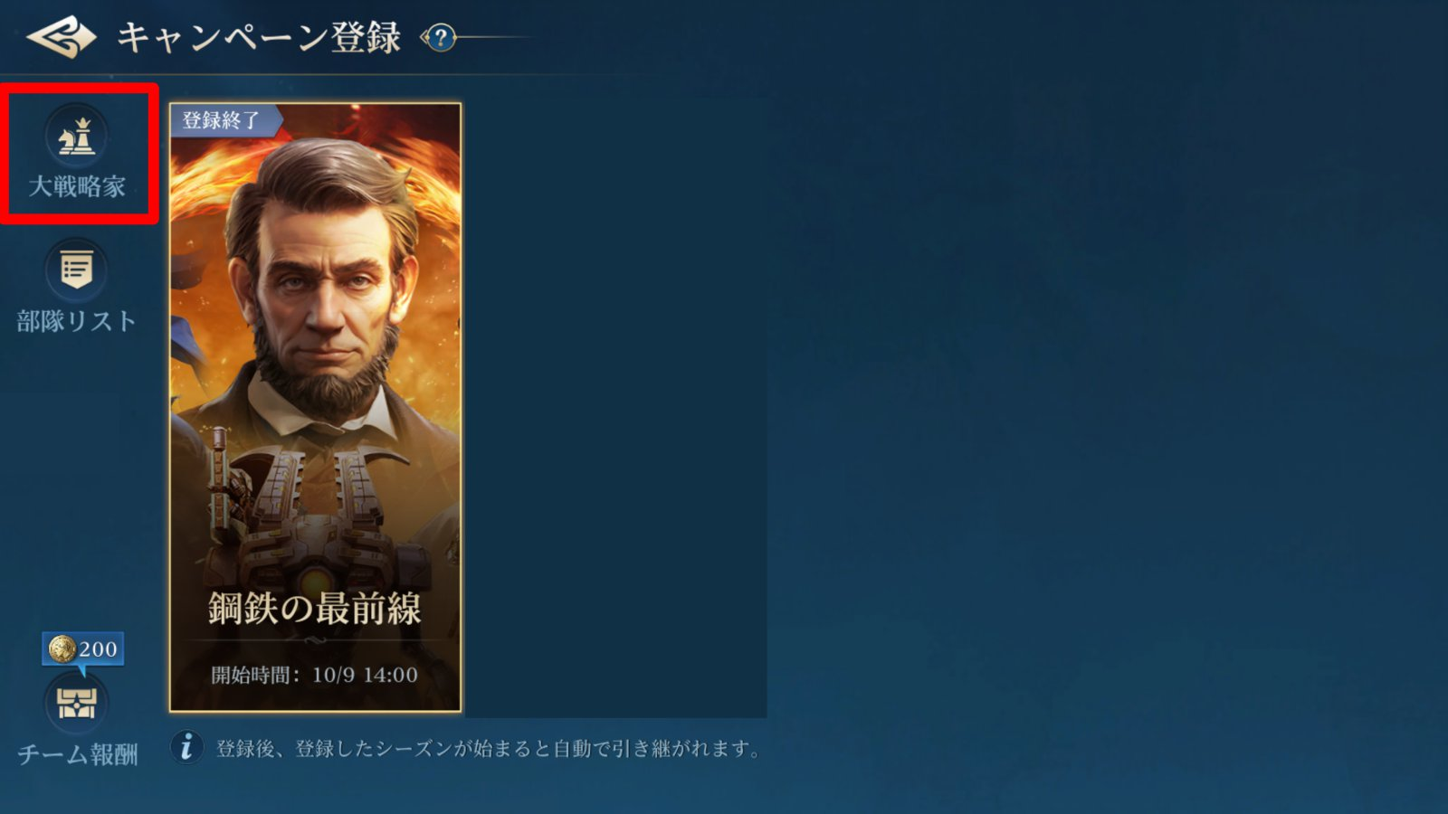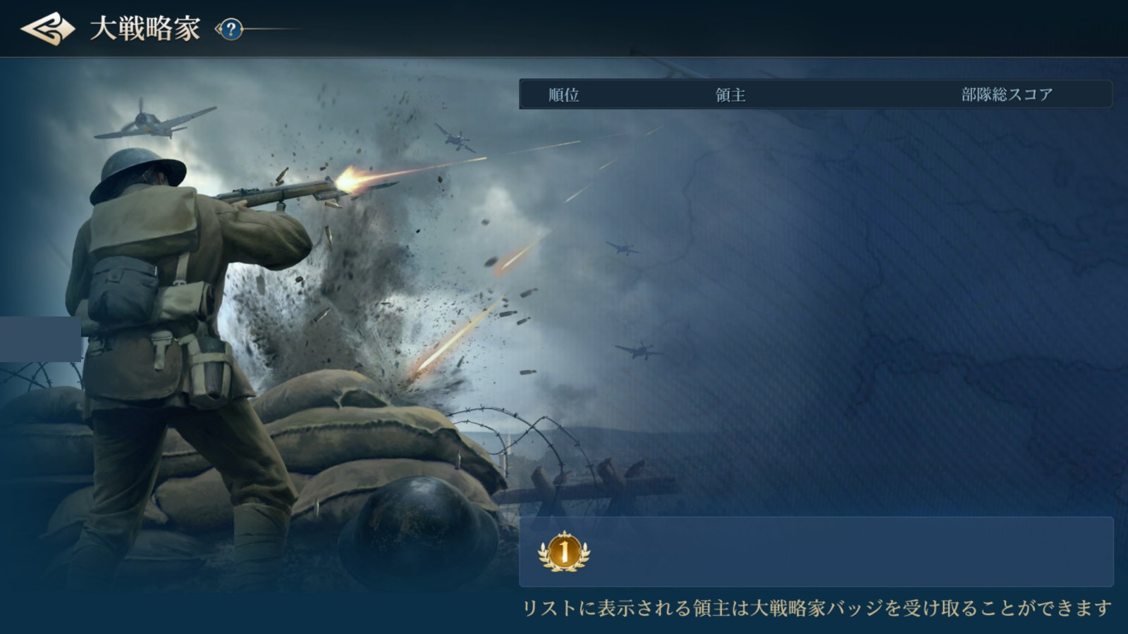 この2つの条件を満たすプレイヤーが大戦略家となる。グランドロビーのキャンペーン選択画面、「大戦略家」の項目から一覧で確認可能だ。