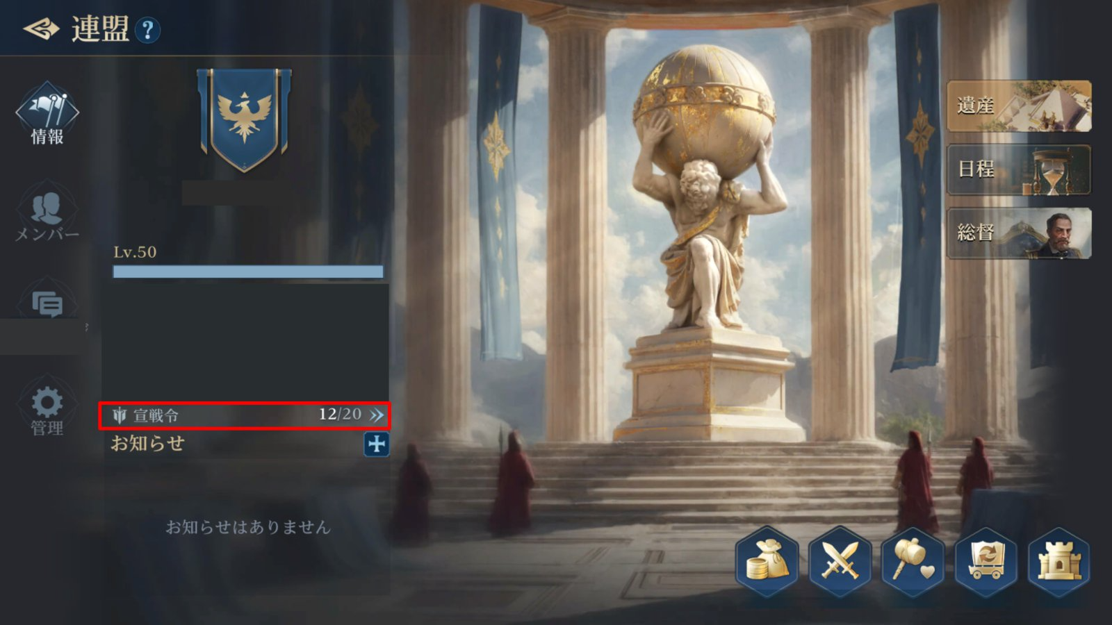 宣戦令は連盟画面で確認することができ、1時間ごとに1回復、20まで所有可能だ。また、都市やゲートのレベルに応じて必要な宣戦令の数は異なる。たとえばレベル7の都市の宣戦布告には7個の宣戦令が必要になるなど、都市/ゲートのレベル=必要な宣戦令の数となる。