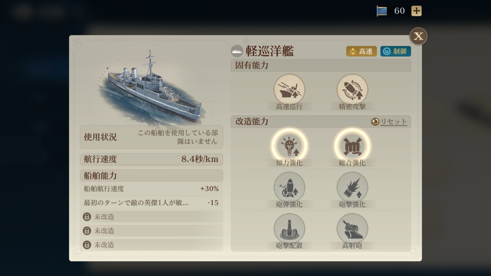 固有能力 | ・高速巡行:船舶部隊の航行速度+30% ・精密攻撃:1ターン目で、敵軍のランダムな英傑1人の敏捷を15ポイントダウンさせる |