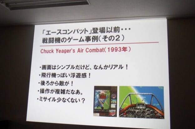 実際『エースコンバット』登場以前の戦闘機ゲームは『アフターバーナー2』に代表される「戦闘機撃墜アクションタイプ」か『Chuck Yeager’s Air Combat」に代表される「フライトシミュレーター」タイプに二分されていた。この両者でお客様の欲求が満たされていれば、『1』のつけいる隙はない。しかし、実際に『1』がヒットしたということは、「面倒な操作や知識を要求されることなく、臨場感のあるスリリングな空中戦がしたい」という隠れたニーズがあったことになる。