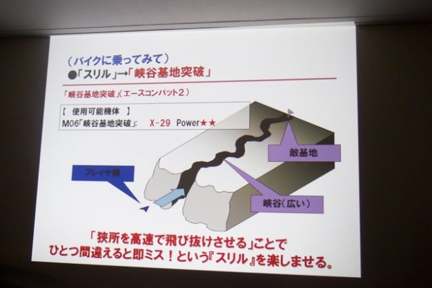 これまで数台のバイクを乗り継いできたという東山氏。バイクに乗ってすり抜けをしたときの高揚感や、50ccと250ccを乗り比べてみて、その乗り味の違いが興味深かった体験を抽象化・仕組み化した結果、エースコンバットシリーズではおなじみの「峡谷をすり抜けるミッション」になったという。