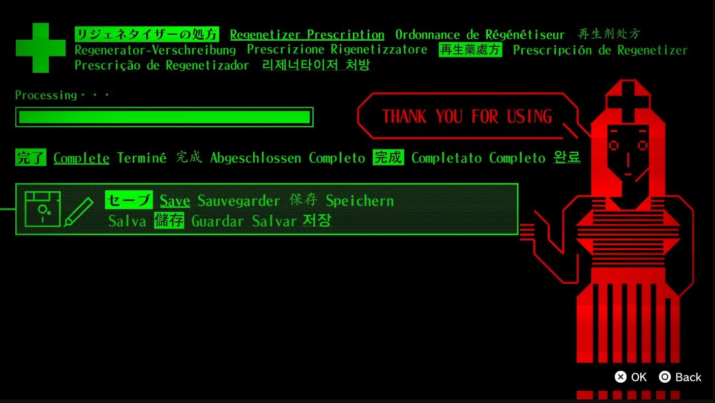 When saving in Romeo Is a Dead Man, a variety of multilingual texts appear alongside a red nurse character. This nurse is a reference to Megumi, a 19-year-old woman from Hokkaido who serves as your opponent in Yakyūken.