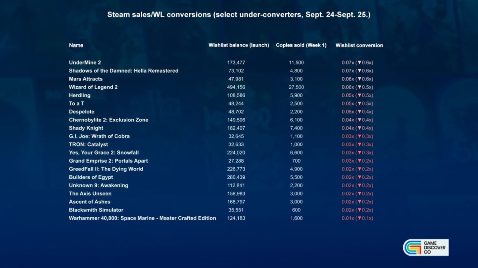 Back in April last year, GameDiscoverCo conducted a survey among game publishers and developers to measure the conversion rate (Wishlist-to-actual sales ratio) of games with over 10,000 Wishlists. The median conversion rate was 0.17, and the accompanying data showed that very few titles managed to outsell its Wishlists by a significant margin.
