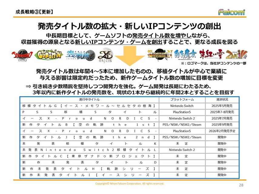 Japanese video game developer Nihon Falcom published its Business Plan and Growth Potential Details document on December 26, analyzing their performance in the previous year and shedding light on new business strategies that the company will be focusing on from the fiscal year ending in September 2026. As reported by GameBiz, in the following years, the company plans to put an emphasis on multiplatform expansion and production of new IP content, with 6 unannounced titles currently in development.