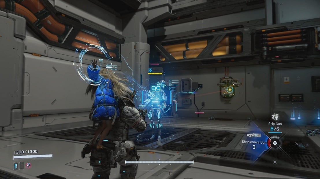 Going back to combat, hacking mode closes once Diana has hacked an enemy. This gives Hugh the chance to get in and deal damage with a wide array of weapons. While he always has access to his Grip Gun (the default handgun with respectable damage and high stopping power), he can also pick up powerful weapons like the Shockwave Gun (a shotgun-like weapon) and Charge Piercer (a chargeable railgun). Like Diana’s special hacking nodes, weapon pickups have limited ammunition and can only be carried one at a time. Finishing the Sketchbook Demo for the first time unlocks a new weapon and hacking node, incentivizing replays alongside the demo’s completion timer.