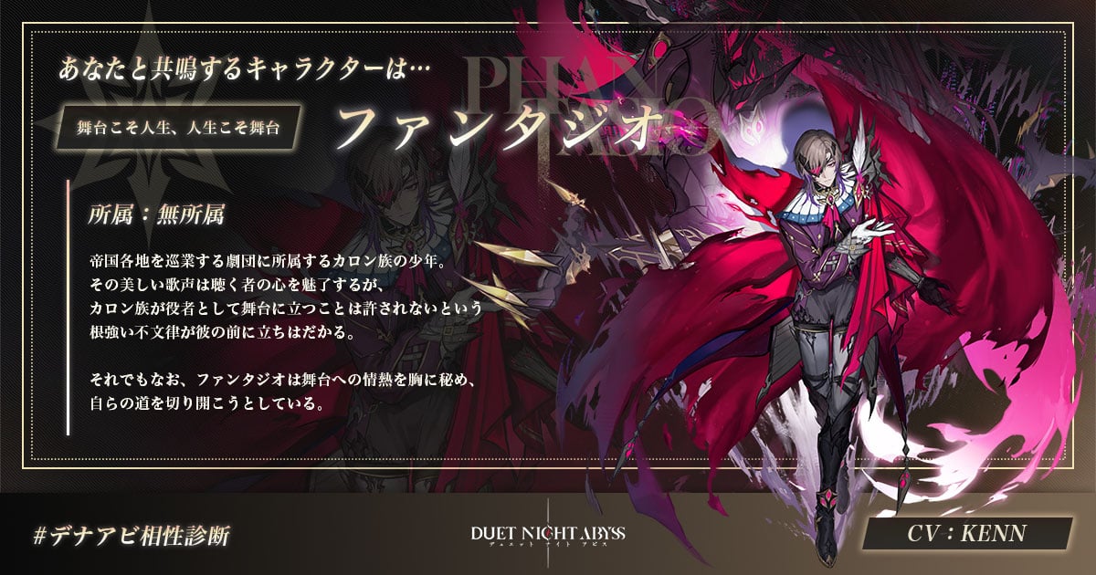 帝国各地を巡業する劇団に所属するカロン族の少年。その美しい歌声は聴く者の心を魅了するが、カロン族が役者として舞台に立つことは許されないという根強い不文律が彼の前に立ちはだかる。それでもなお、ファンタジオは舞台への情熱を胸に秘め、自らの道を切り開こうとしている。